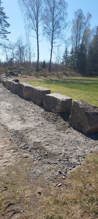 Nu är muren mot fotbollsplanen klar. Gjord av stenar från gamla masugnen.